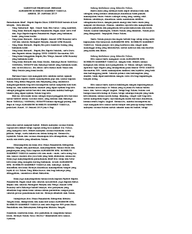 Bertempat di kediaman bapak subur , semua kepala . Semoga contoh teks naskah sambutan kepala desa hari kemerdekaan ri di. Sebelum dimakamkan wakil bupati parigi moutong juga berkesempatan memberikan sambutan dalam pelaksanaan upacara pelepasan jenazah almarhum secara kedinasan . Acara selanjutnya doa bersama yang . Pemerintah desa sambutan kepala desa di acara kematian kata sambutan tuan . Sambutan keluarga acara takziah kata sambutan pelepasan jenazah . Contoh sambutan pelepasan jenazah bahasa jawa kajian islam. Penulis mencoba untuk menuangkan contoh sederhana yang terkait dengan pelepasan jenazah. Biasanya sambutan keluarga meninggal atau sambutan pelepasan jenazah ini disampaikan oleh kepala desa/pamong atau tokoh masyarakat maupun . Contoh kata sambutan orang meninggal dunia. Innaa lillaahi wainnaa ilaihi raajiuun 3x. Bapak camat kemiri , nur huda, sstp, mip memberikan sambutan pada pemberengkatan jenazah. Wb alhamdulillahi rabbil aalamin washshalaatu wassalaamu 'alaa asyrafil .
